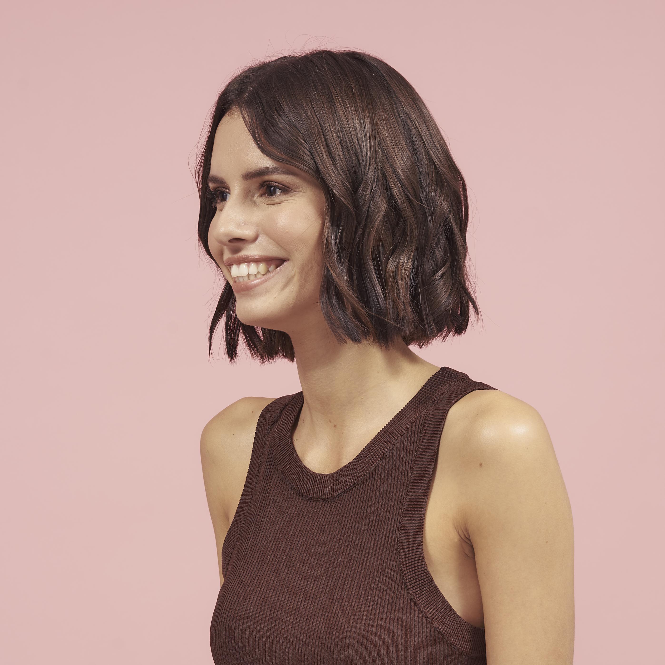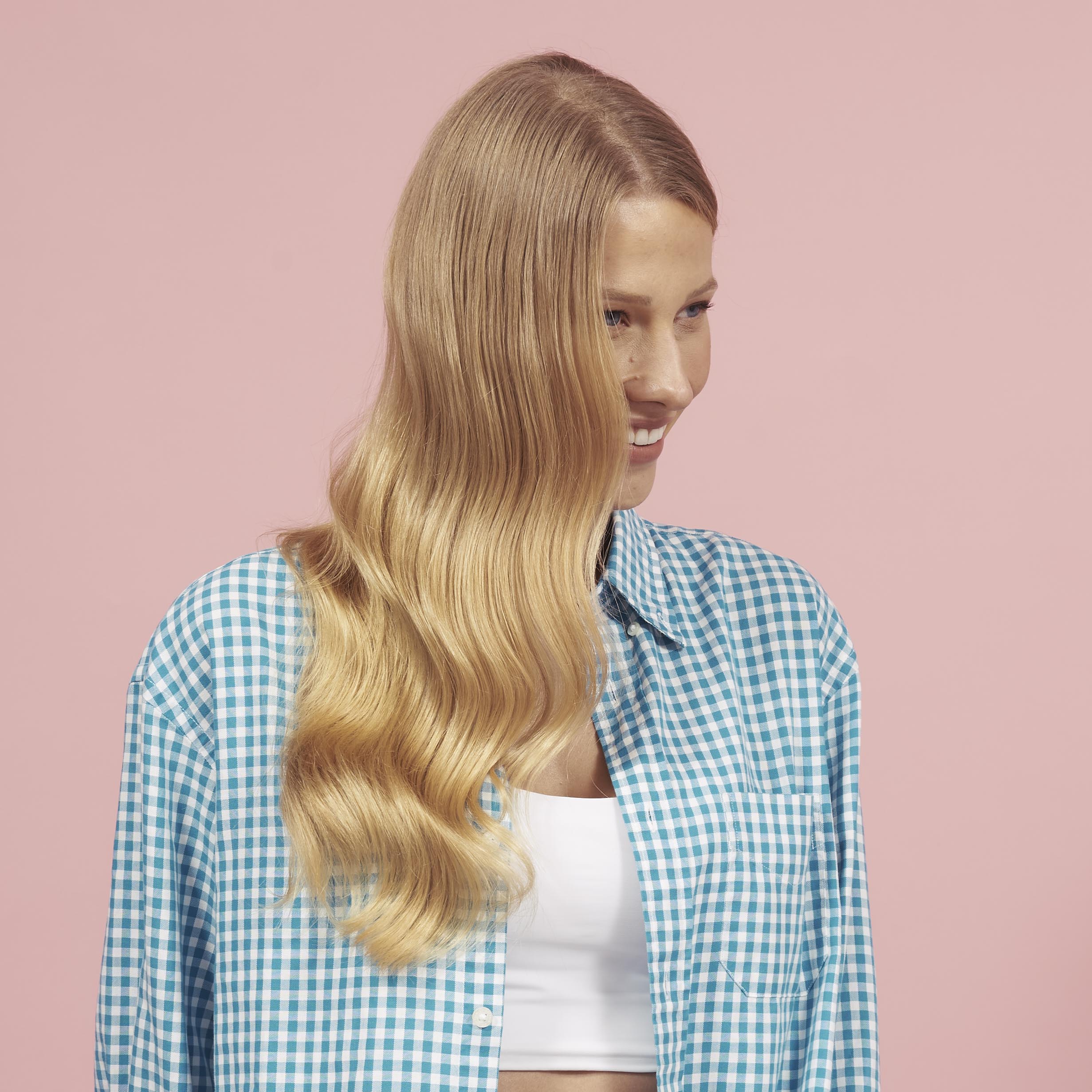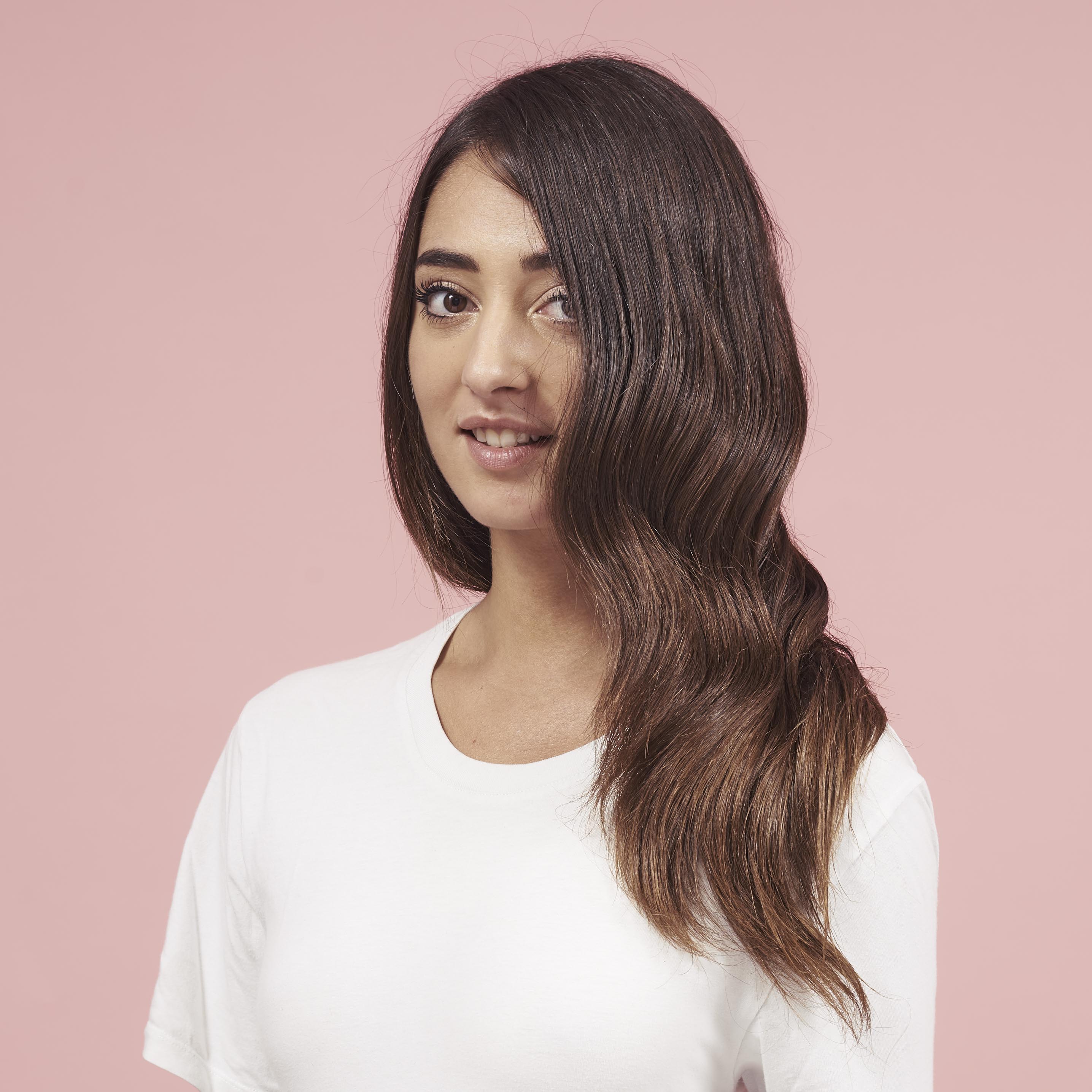Smooth and voluminous styling at the roots with rounded ends that gives a nod to 70s hair styles